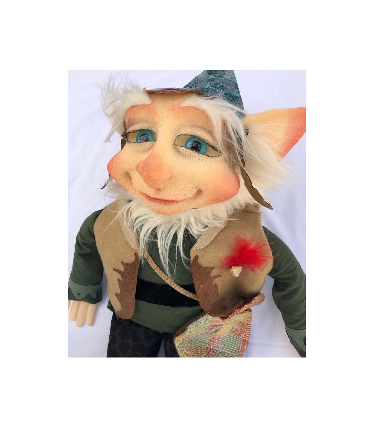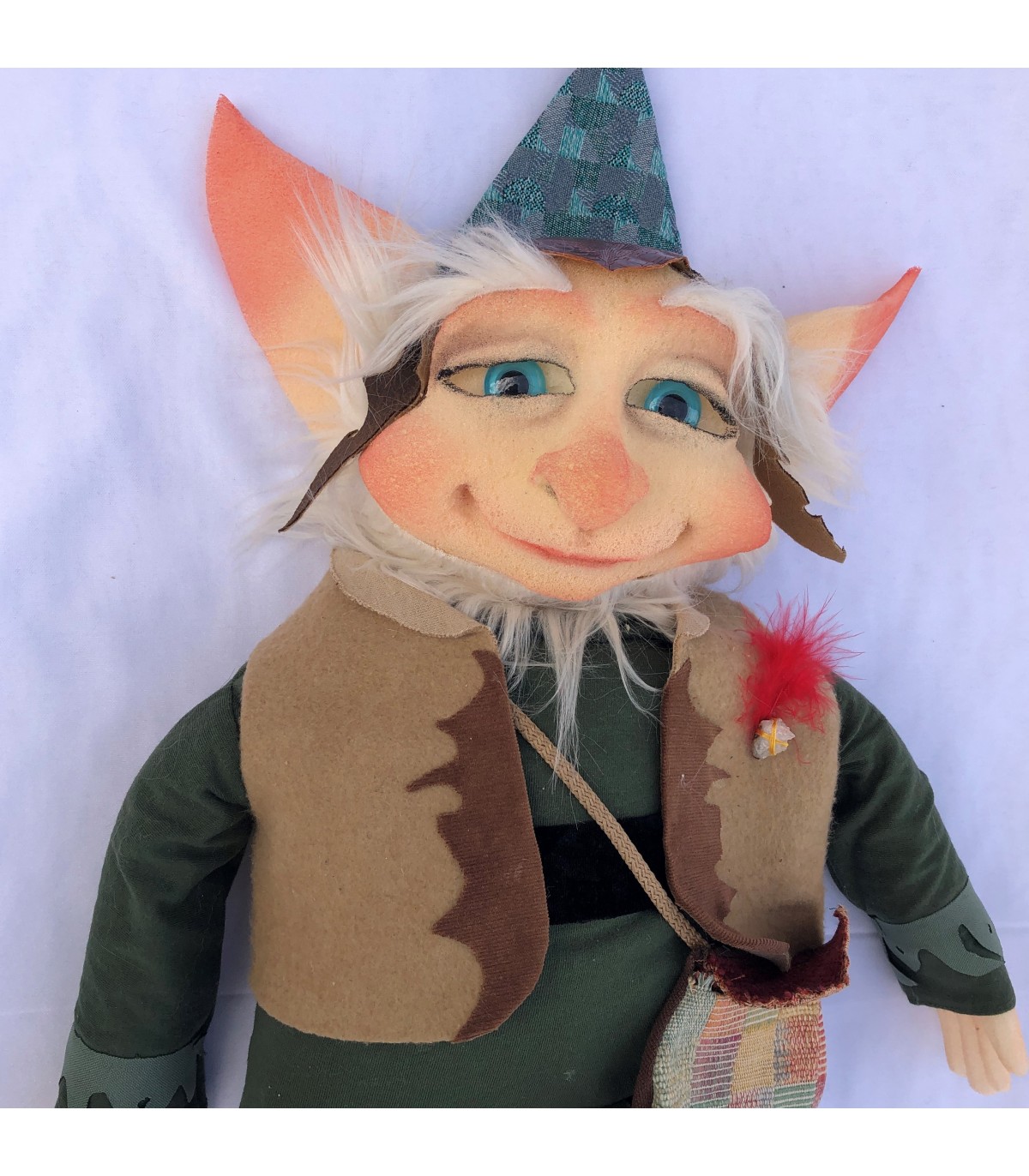 The 60 cm Full-Body Elf Puppet is hand-carved from a solid block of soft foam. It features movement in the eyes, mouth, and full face, allowing for a wide range of expressions. It is operated from inside the body, offering direct and comfortable control.